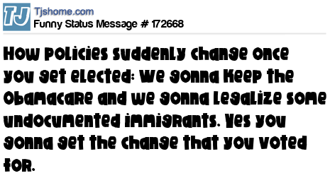 X says How policies suddenly change once you get elected: We gonna keep the Obamacare and we gonna legalize some undocumented immigrants. Yes you gonna get the change that you voted for.