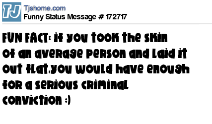 - # 79476 Fun fact: If you took the skin of an average person and laid it flat you would have enough to get a pretty serious criminal conviction.