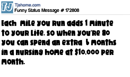 - # 104342 Every mile you jog adds 1 minute to your life, so when you're 85 you can spend an extra 5 months in a nursing home at $8,000 per month.