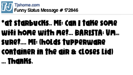 X says *at starbucks.. ME: Can I take some wifi home with me?... BARISTA: Um,,, sure?.... ME: (holds tupperware container in the air & closes lid) ... Thanks.