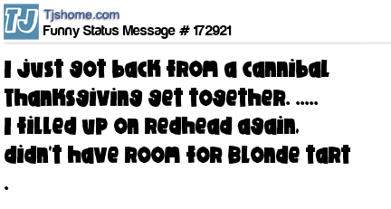 X says I just got back from a cannibal Thanksgiving get together. ..... I filled up on redhead again, didn't have room for Blonde tart .