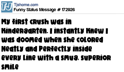 X says My first crush was in kindergarten. I instantly knew I was doomed when she colored Neatly and Perfectly inside every line with a smug, superior smile