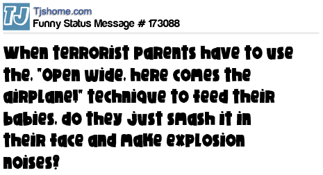 - # 162527 When terrorists parents have to use the, "Open wide, here comes the airplane!" technique, do they just smash it in their face and make explosion noises?