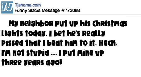 X says My neighbor put up his Christmas lights today. I bet he's really pissed that I beat him to it. Heck, I'm not stupid .... I put mine up three years ago!