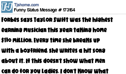 X is Forbes says Taylor Swift was the highest earning musician this year taking home $170 million. Every time she breaks up with a boyfriend, she writes a hit song about it. If this doesn't show what men can do for you ladies, I don't know what does.
