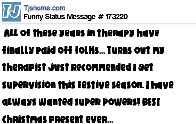 - # 82014 All these years in therapy have finally paid off people... My therapist just recommended I get supervision this festive season. I have always wanted super powers! BEST Christmas present ever...