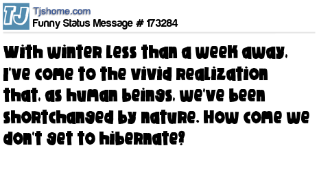 X With winter less than a week away, I've come to the vivid realization that, as human beings, we've been shortchanged by nature. How come we don't get to hibernate?