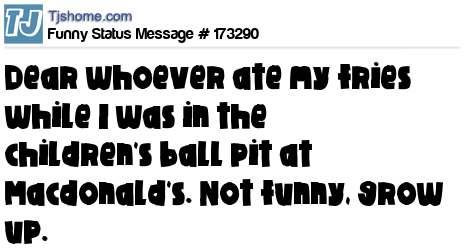 - # 141882 Dear whoever ate my fries while I was in the ball pit at McDonalds... Not funny, grow up.