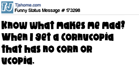 X Know what makes me mad? When I get a Cornucopia that has no corn or ucopia.