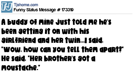 - # 83187 A buddy of mine just told me he's been getting it on with his girlfriend and her twin...I said, "Wow, how can you tell them apart?" He said, "Her brother's got a mustache."