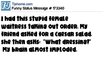 X I had this stupid female waitress taking out order. My friend asked for a Caesar salad, she then asks: "What dressing?" My brain almost imploded.