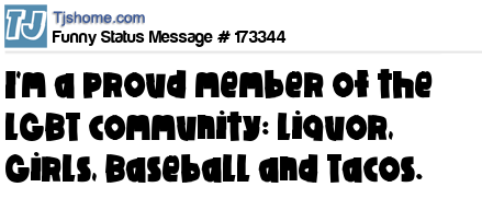 X I'm a proud member of the LGBT community: Liquor, Girls, Baseball and Tacos.