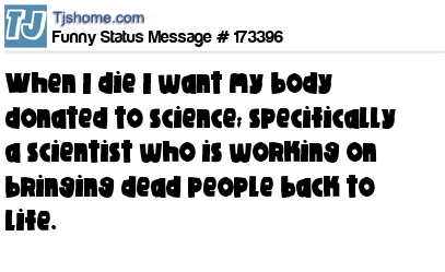 - # 115230 When I die I want my body donated to science, but more specifically a scientist who is working on bringing dead guys back to life.
