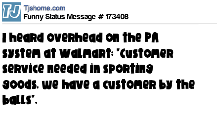 X says I heard overhead on the PA system at Walmart: "Customer service needed in sporting goods, we have a customer by the balls".