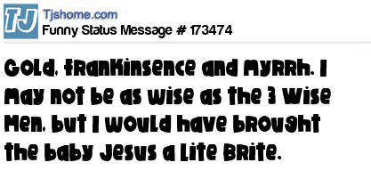 X Gold, frankinsence and myrrh. I may not be as wise as the 3 Wise Men, but I would have brought the baby Jesus a Lite Brite.