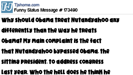 X says Why should Obama treat Nutandyahoo any differently than the way he treats Obama? My main complaint is the fact that Nutandyahoo bypassed Obama, the sitting president, to address congress last year. Who the hell does he think he is? Payback s a bi*ch ain't