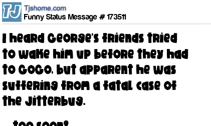 X is I heard George's friends tried to wake him up before they had to GoGo, but apparent he was suffering from a fatal case of the Jitterbug.