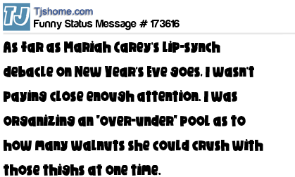 X As far as Mariah Carey's lip-synch debacle on New Year's Eve goes, I wasn't paying close enough attention. I was organizing an "over-under" pool as to how many walnuts she could crush with those thighs at one time.