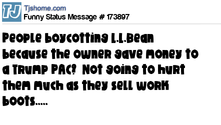 X says People boycotting L.L.Bean because the owner gave money to a Trump PAC? Not going to hurt them much as they sell work boots.....