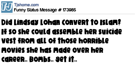 X is Did Lindsay Lohan Convert to Islam? If so she could assemble her suicide vest from all of those horrible movies she has made over her career.. Bombs.. get it..