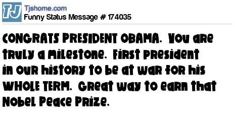 X says CONGRATS PRESIDENT OBAMA. You are truly a milestone. First president in our history to be at war for his WHOLE TERM. Great way to earn that Nobel Peace Prize.