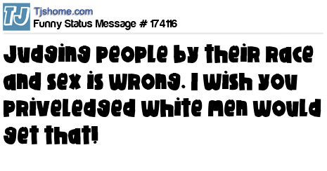 - # 166029 Judging people by their race and sex is wrong, I wish you privileged white males would get that!