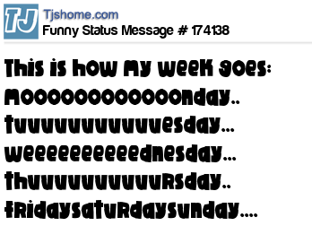 - # 72946 This is how my week goes mooooooooooooonday.. tuuuuuuuuuuuuesday... weeeeeeeeeeednesday... thuuuuuuuuuuursday.. fridaysaturdaysunday....
