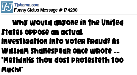 X says Why would anyone in the United States oppose an actual investigation into Voter Fraud? As William Shakespear once wrote .... "Methinks thou dost protesteth too much!"