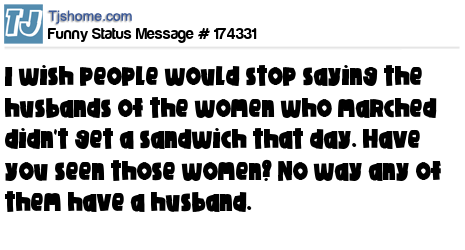 X I wish people would stop saying the husbands of the women who marched didn't get a sandwich that day. Have you seen those women? No way any of them have a husband.