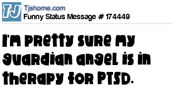 X says I'm pretty sure my guardian angel is in therapy for PTSD.