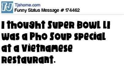 X I thought Super Bowl LI was a Pho Soup special at a Vietnamese restaurant.