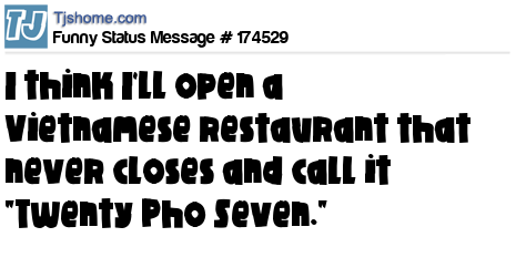 X says I think I'll open a Vietnamese restaurant that never closes and call it "Twenty Pho Seven."