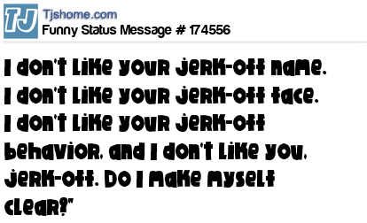 X says I don't like your jerk-off name. I don't like your jerk-off face. I don't like your jerk-off behavior, and I don't like you, jerk-off. Do I make myself clear?"
