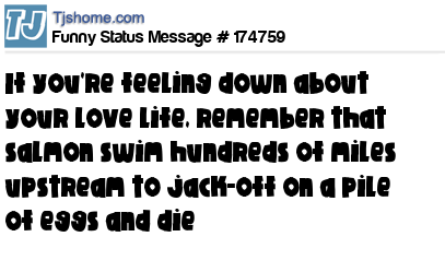 X says if you're feeling down about your love life, remember that salmon swim hundreds of miles upstream to jack-off on a pile of eggs and die