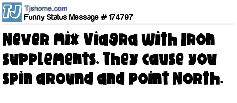 - # 208130 Never mix Viagra with Iron Supplements. It will cause you to spin around and point North.