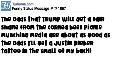 X says The odds that Trump will get a fair shake from the corned beef pickle munching media are about as good as the odds I'll get a Justin Bieber tattoo in the small of my back!