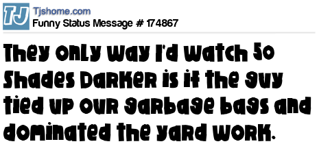X says They only way I'd watch 50 Shades Darker is if the guy tied up our garbage bags and dominated the yard work.