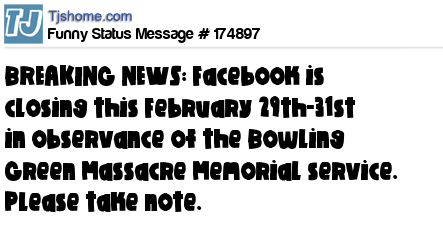 X says BREAKING NEWS: Facebook is closing this February 29th-31st in observance of the Bowling Green Massacre Memorial service. Please take note.