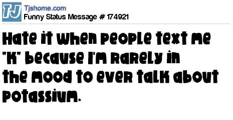 X says Hate it when people text me "k" because I'm rarely in the mood to ever talk about potassium.