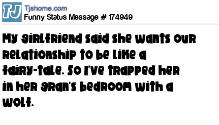 X says My girlfriend said she wants our relationship to be like a fairy-tale. So I've trapped her in her gran's bedroom with a wolf.