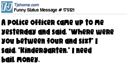 - # 184038 A police officer came up to me yesterday and said, "Where were you between four and six?" I said, "Kindergarten." I need bail money now