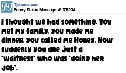 - # 139350 I thought we had something. You met my family, made me dinner, called me honey. Now suddenly you’re a “waitress” who was “doing her job?”