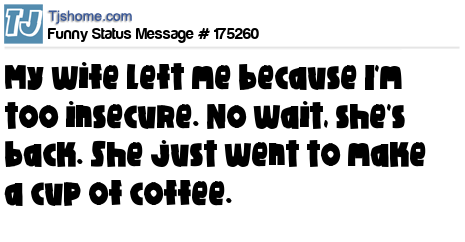 X says My wife left me because I'm too insecure. No wait, she's back. She just went to make a cup of coffee.