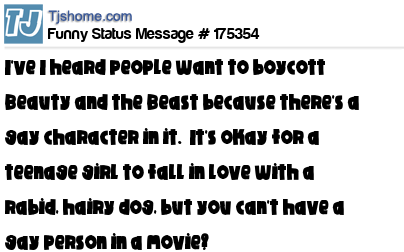X says I've I heard people want to boycott Beauty and the Beast because there's a gay character in it. It's okay for a teenage girl to fall in love with a rabid, hairy dog, but you can't have a gay person in a movie?