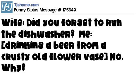X says Wife: Did you forget to run the dishwasher? Me: [drinking a beer from a crusty old flower vase] No. Why?