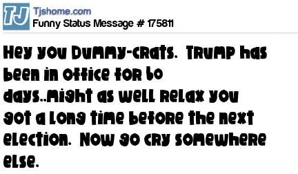 X says Hey you Dummy-crats. Trump has been in office for 60 days..might as well relax you got a long time before the next election. Now go cry somewhere else.