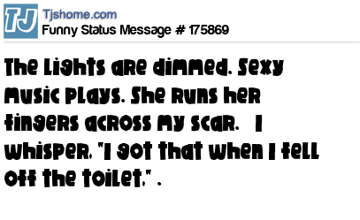 X says The lights are dimmed. Sexy music plays. She runs her fingers across my scar. I whisper, "I got that when I fell off the toilet," .