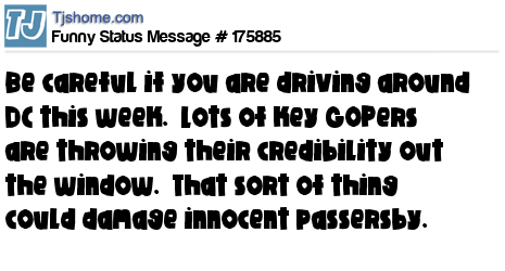 X says Be careful if you are driving around DC this week. Lots of key GOPers are throwing their credibility out the window. That sort of thing could damage innocent passersby.