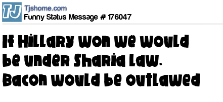 X says If Hillary won we would be under Sharia law. Bacon would be outlawed