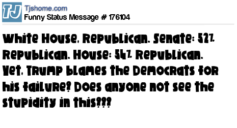 X is White House, Republican. Senate: 52% Republican. House: 54% Republican. Yet, Trump blames the Democrats for his failure? Does anyone not see the stupidity in this???